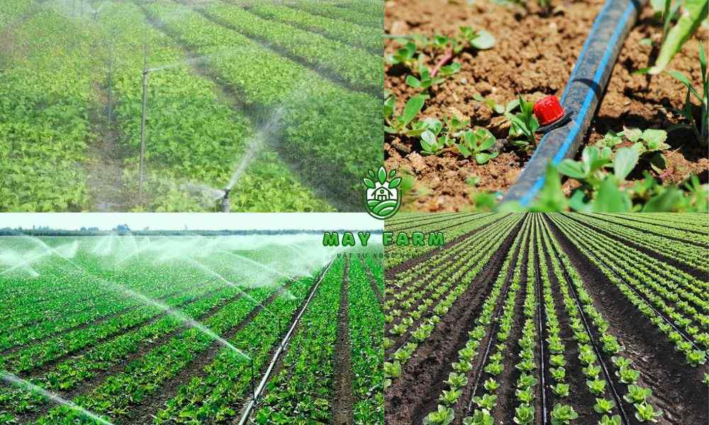 Hệ thống tưới phun mưa: Tưới phun mưa là hình thức mô phỏng mưa nhân tạo, phù hợp với những loại cây có mật độ trồng dày như ớt, dưa hấu, chuối. Hệ thống này dùng các đầu béc phun đều nước trên diện rộng, giúp duy trì độ ẩm ổn định và làm mát cho cây vào những ngày nắng nóng.